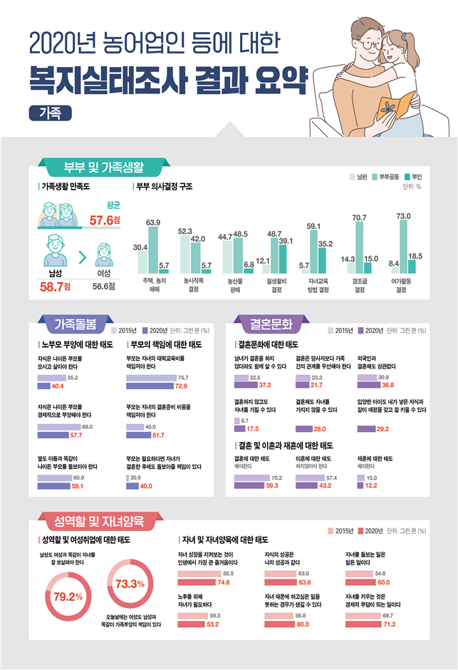 농촌진흥청(청장 허태웅)은 전국 농어촌에 거주하는 4,000가구를 대상으로 가족, 교육, 지역사회와 공동체, 생활 부문에 걸쳐 복지실태를 조사한 ‘2020 농어업인 등에 대한 복지실태’ 결과를 발표했다.
