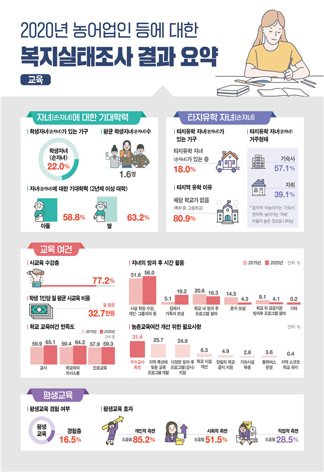 또한, 농촌 학생 대부분이 사교육을 받고 있으며(77.2%), 월평균 사교육 비용은 32.7만 원이었고, 50만 원 이상 지출하는 가구도 26.5%에 달했다.