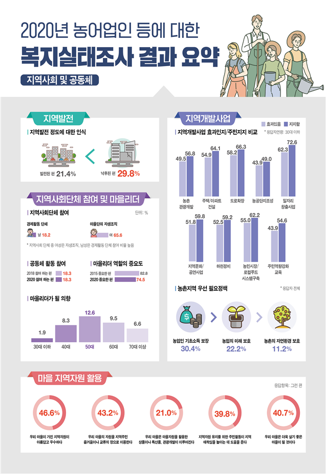 농촌지역 마을공동체 활동에 ‘참여하지 않는다(54.4%)’라는 비율이 11.5%P 증가했고, ‘마을 리더의 역할이 중요하다(74.5%, 8.3%P↓)’라고 생각하지만 ‘마을 지도자가 될 의향은 없다(79.0%)’라는 비율이 5년 전보다 늘었다.