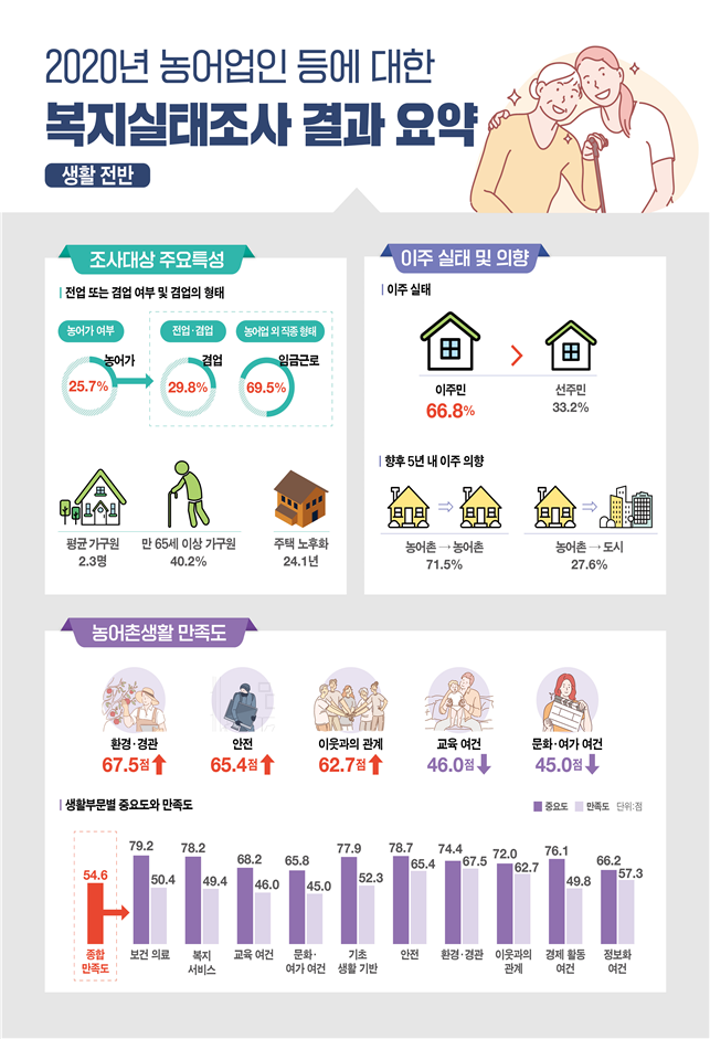 코로나19에도 불구하고 농촌 주민들의 종합생활 만족도는 지난해 54.3점과 비슷한 54.6점으로 나타났다.