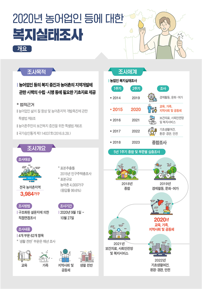 농촌진흥청은 2013년부터 해마다 ‘농어업인 삶의 질 향상 및 농어촌지역 개발 촉진에 관한 특별법(제8조)’에 근거해 농어업인 등에 대한 복지실태 조사(국가승인통계 제114037호)를 실시하고 있다. 조사 결과는 농어업인 등의 복지 증진과 농어촌 지역 개발 정책을 효과적으로 추진하기 위한 기초자료로 이용된다.