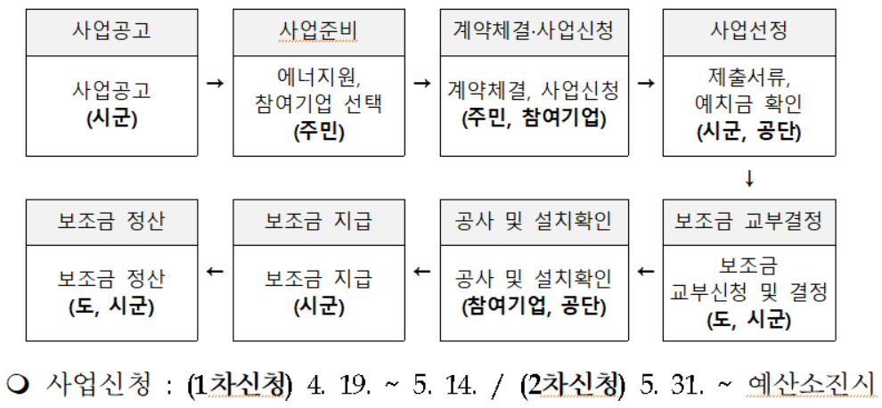 자세한 사업내용은 주소지 관할 시·군홈페이지에서 확인할 수 있으며,사업신청은 이달 19일부터 5월 14일까지 에너지공단 그린홈 홈페이지(https://greenhome.kemco.or.kr/index.do)에서 가능하다