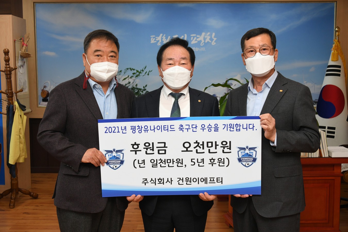 주식회사 건원이에프티(대표자 이화진)는 19일 평창군수 집무실에서 평창유나이티드 FC에 후원금 1천만 원을 기탁했다.
