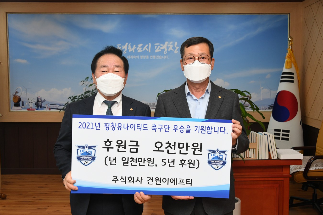주식회사 건원이에프티는 방림농공단지에 위치한 전기전문업체로써 올해를 시작으로 매년 1천만 원씩 5년 동안 총5천만 원을 평창유나이티드 FC에 기탁하기로 했다.