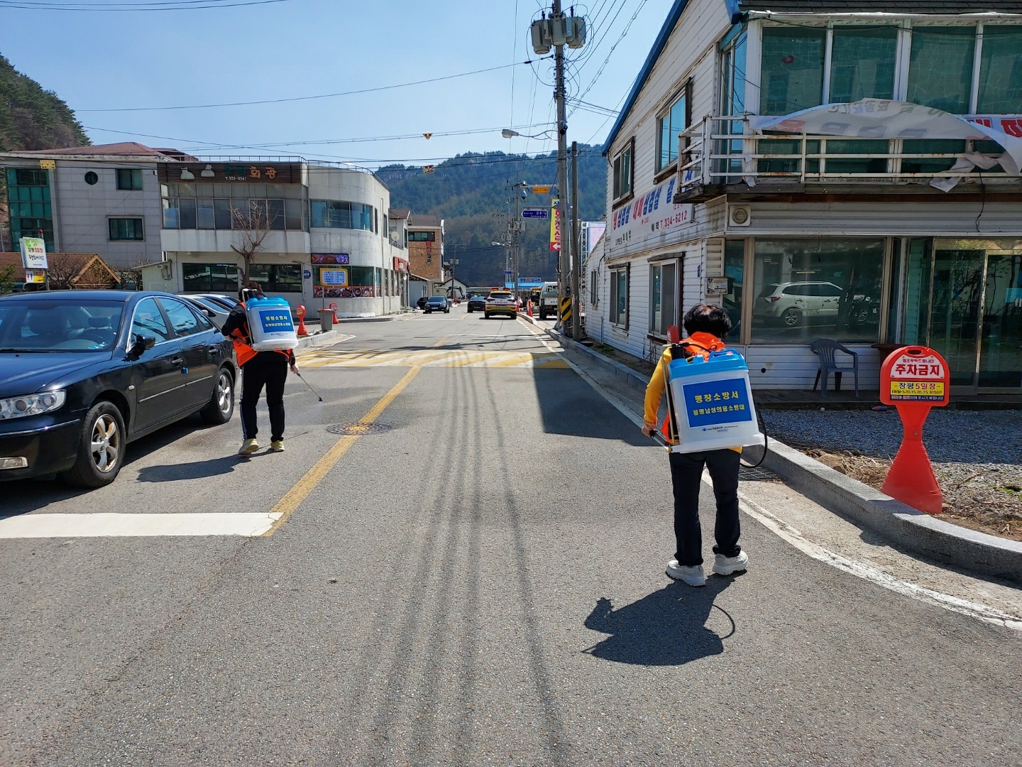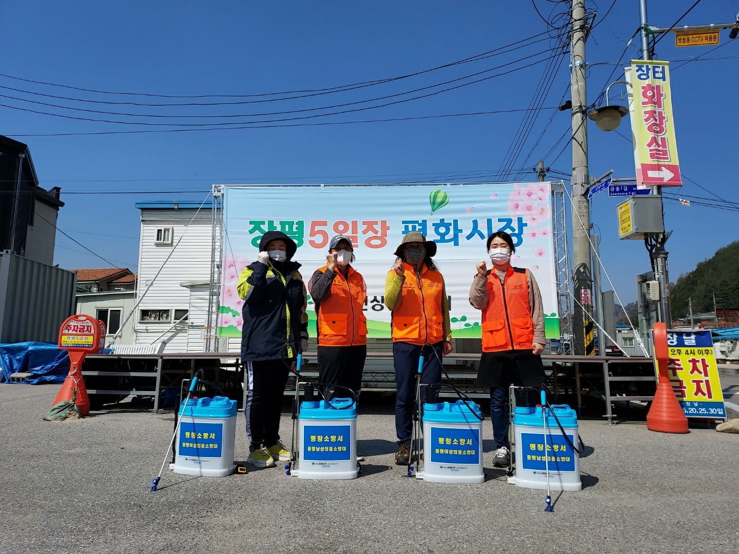4월 20일 '장평오일장' 방역을 위하여 19일 오후3시 [용평면여성의용소방대]가 분무기를 짊어지고 장터를 샅샅이 뿌리는 모습이 멋집니다. 마스크만 잘 착용하시고 시장을 보셔도 좋겠습니다. 씩씩한 여성들의 모습이 귀하게 여겨지는 풍경입니다.