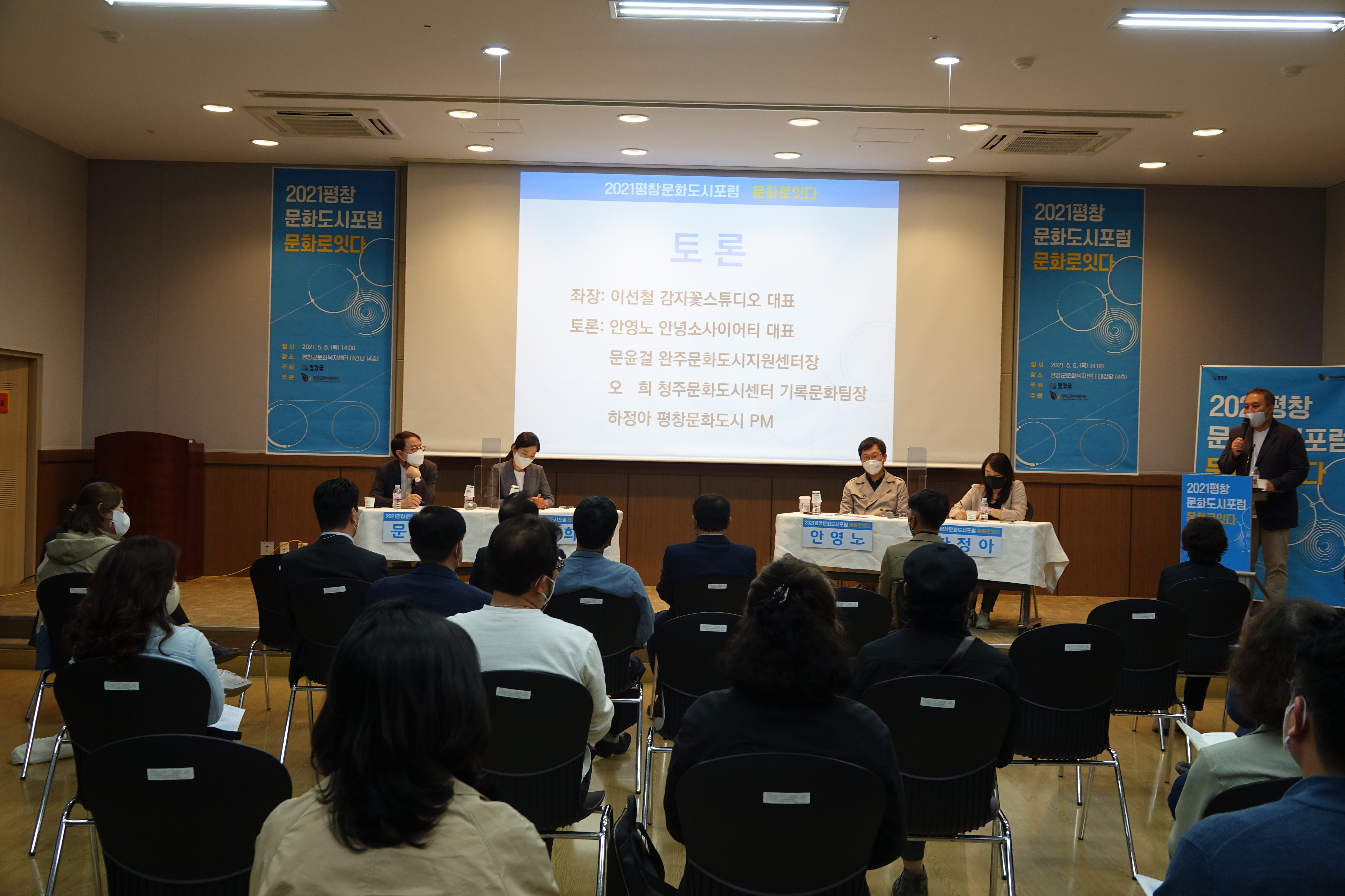 이선철 감자꽃스튜디오 대표가 좌장을 맡은 오후 2시 포럼에서는 문화도시와 지역발전에 대한 이해 및 지속가능한 조성방향에 대해 안영노 안녕소사이어티 대표의 기조발제 후, 문윤걸 완주문화도시지원센터장과 오희 청주 문화도시센터 기록문화팀장의 거버넌스 구축사례 제시에 이어 하정아 평창문화도시 총괄기획가의 문화도시 추진방향 발제를 끝으로 깊이 있는 토론이 이어졌다.