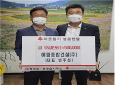○ 지난(5.25.) 예림종합건설(대표 변주섭)은 평창읍에 어려운 이웃들을 위해 써달라는 의미로 성금 50만원을 전달하였음.