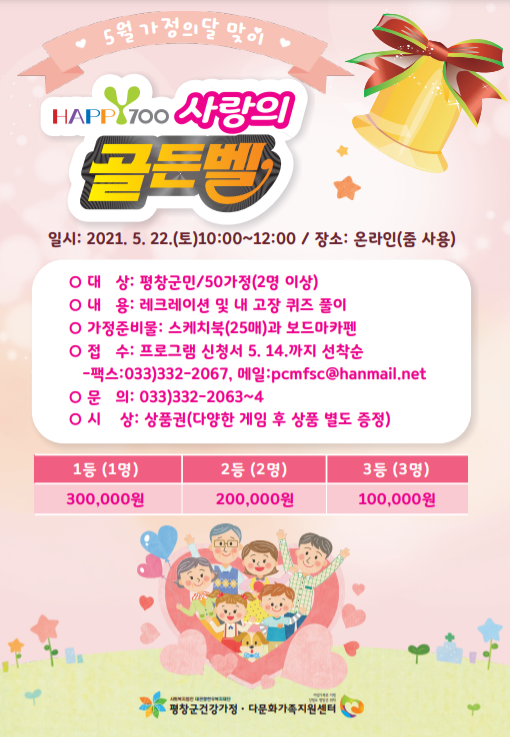5월 가정의 달을 맞아 평창군이 주최하고 평창군건강가정다문화가족지원센터가 주관하는 “HAPPY700 사랑의 골든벨행사가 오는 22일 비대면(온라인)으로 진행된다.