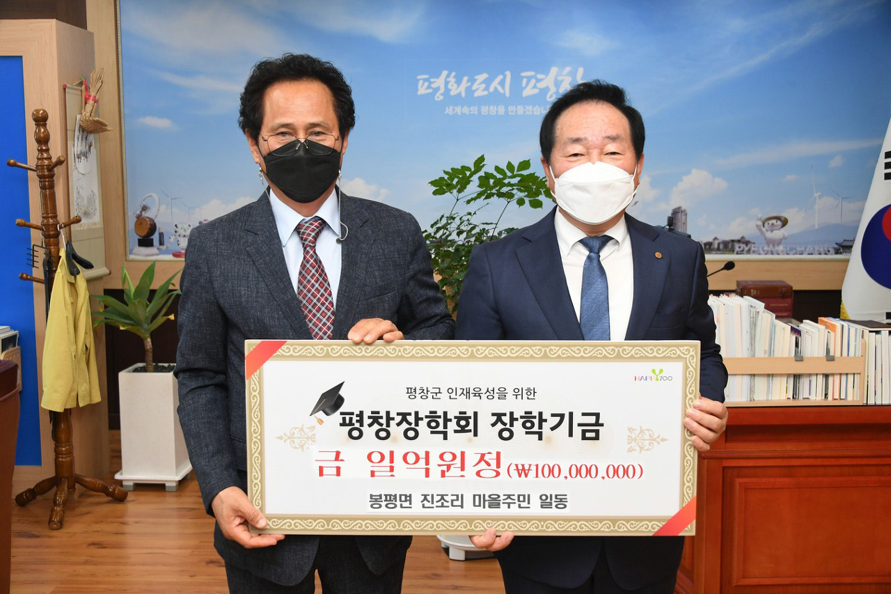 기탁한 장학금은 진조리 마을 100여 가구 180여명의 주민들이 평창군의 미래인 우수인재 발굴을 위해 합심하여 마을공동기금에서 1억 원을 기탁하였다.