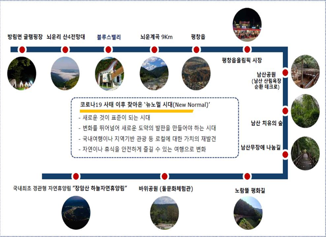 이번에 구축되는 에코힐링로드는 카라반 체험이 가능한 블루스밸리 및 2022년 개방 예정인 방림 야영 캠핑장(가칭)에서부터 시작해, 중간에 올림픽시장을 포함하고, 장암산하늘자연휴양림을 종점으로 구성되어 있어, 산림 중심의 자연 관광과 더불어 다양한 먹거리와 특산물을 접하거나 자연 속 숙박 체험도 가능하다.