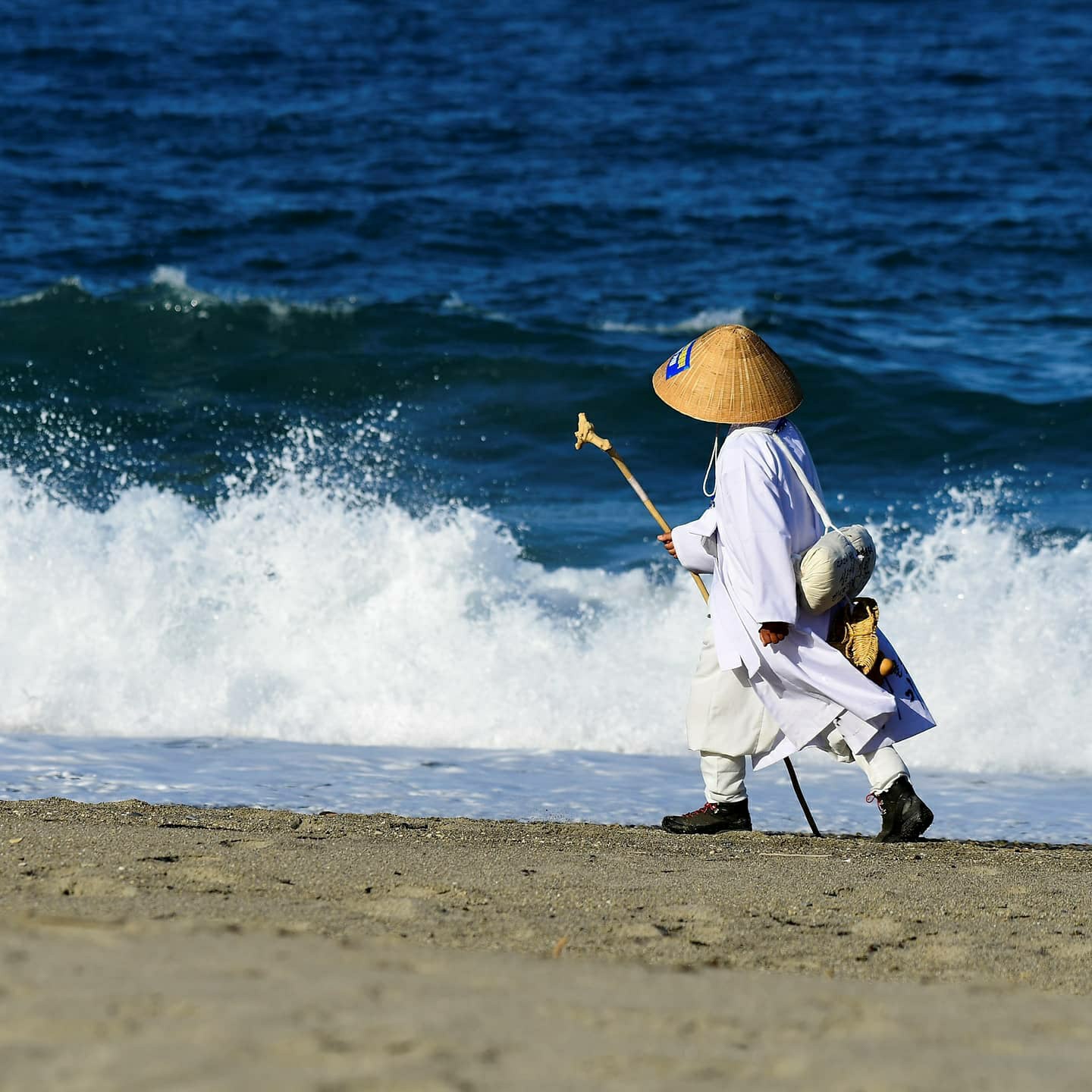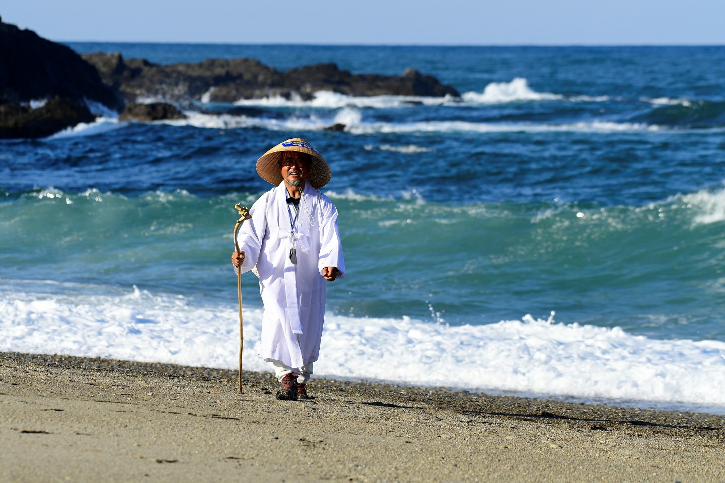 첫날부터 발에 물집이 생기서 터지는 고생을 했지만 2주가 지난 지금은, 쓰라리던 상처에 새살이 돋아나 굳은살로 변했다. 밤잠은 차에서 자고 식사는 시골 주막이든 횟집이든 발길 가는 곳에서 해결한다. 흰 한복에 삿갓을 쓰고 누런 속살을 드러낸 구부러진 나무 지팡이는 손잡이가 힘겨워 보인다. 바랑 끝에 매달려 떨어질 듯 흔들거리는 짚신 한 켤레가 안동김씨 김삿갓의 후예임을 알려준다.