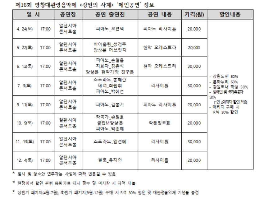강원도가 주최하고 강원문화재단(대표이사 김필국)이 주관하는 평창대관령음악제(예술감독 손열음)의 연중 프로그램 <강원의 사계>가 평창 알펜시아 콘서트홀에서 열린다.