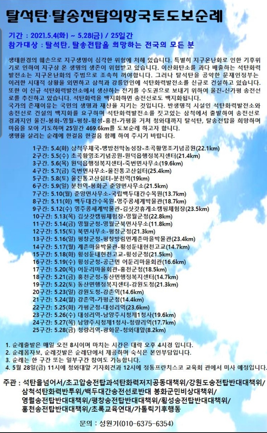 탈석탄, 탈송전탑 운동은 전국적으로 실시되고 있다. 지난 16일에는 탈석탄, 탈송전탑 희망 국토도보순례단이 평창을 찾아 비가 오는 날씨에도 국토도보순례를 실시했다. 반생명적인 시설인 석탄화력발전소와 송전선로 건설의 백지화를 요구하며 석탄화력발전소를 짓고있는 삼척에서 출발하여 송전선로 경과지인 울진, 봉화, 영월, 평창, 홍천, 가평을 가쳐 청와대까지 탈석탄, 탈송전탑을 희망하며 마음을 모아 기도하며 25일간 469.6km를 순례하고 있다. 5.15일에는 영월군 북면면사무소에서 평창군청까지 21.3km를 걸었으며 16일에는 평창군청에서부터 평창방림면 계촌마을 박물관 까지 23.4km를 걸었다.