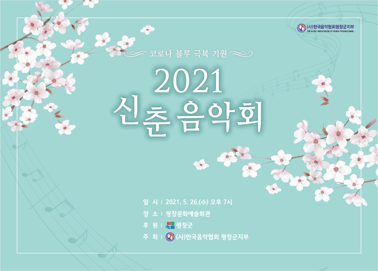 (사)한국음악협회 평창군지부(지부장 이성미) 신춘 음악회를 개최한다. 오는 26일 수요일 7시 평창군문화예술회관에서 개최되며 코로나19로 지친 지역민들을 위로하는 마음을 담아 클래식과 대중음악을 선보인다.