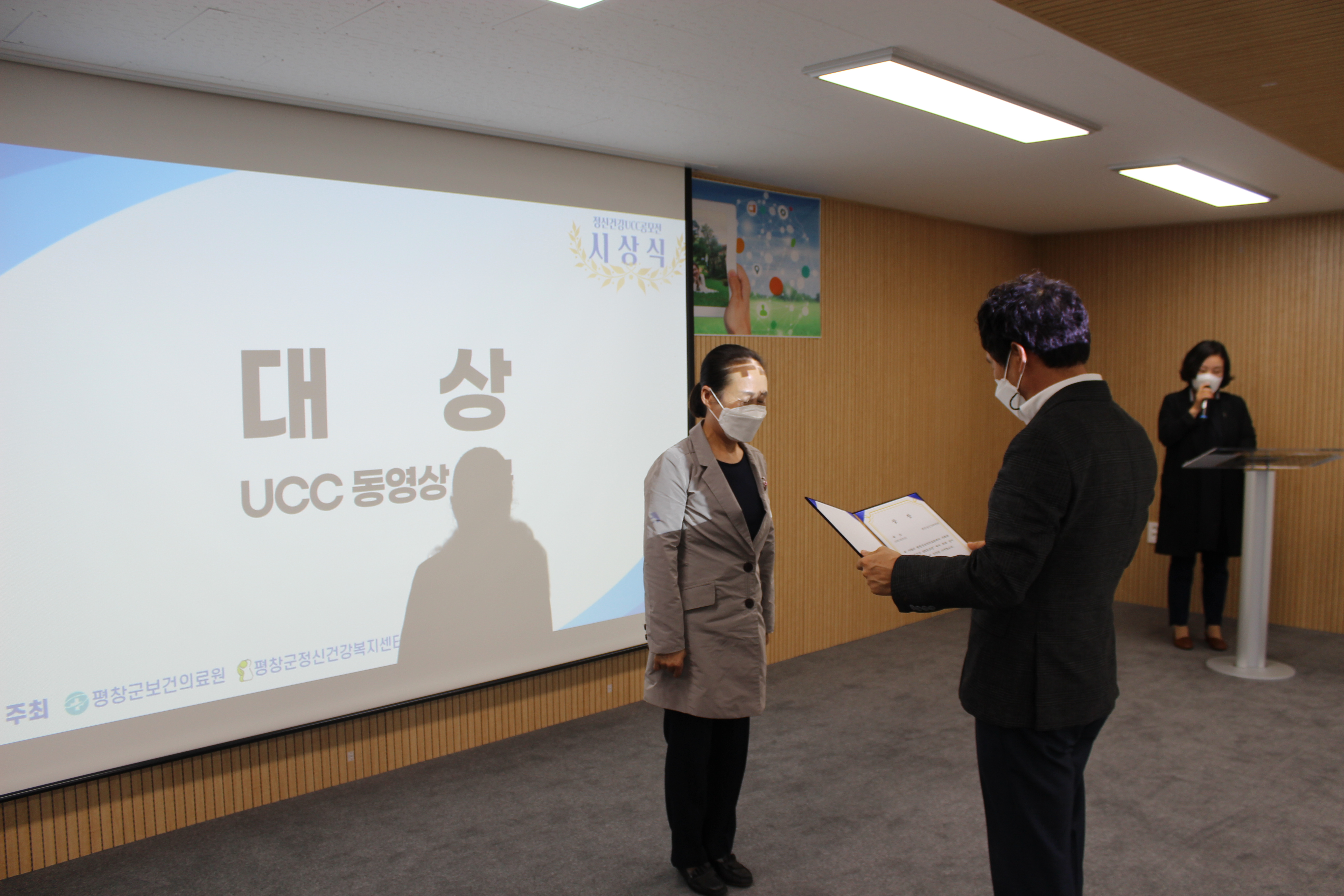 이날 UCC부문 대상인 평창읍건강위원회의 ‘물럿거라! 코로나19 돌개차기가 나가신다!’를 비롯한 8편의 수상자와 포토에세이 부문 대상 전창순님의 ‘코로나19 나만의 거리두기 방법’을 비롯한 8편의 수상자가 시상식에 참여하였으며 시상식은 사회적 거리두기 방역수칙을 철저히 수행한 가운데 진행되었다.