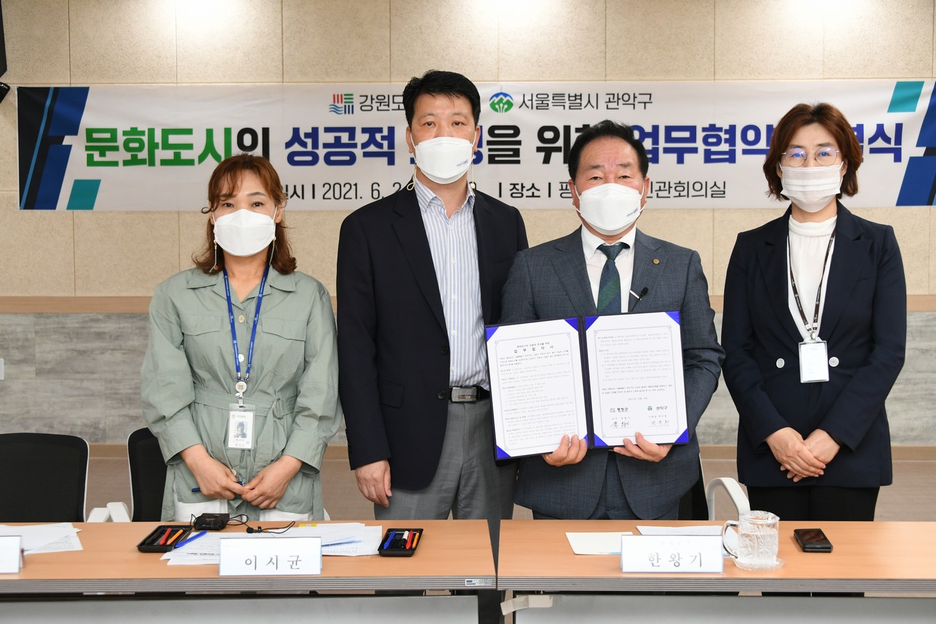 평창군(군수 한왕기)는 2일 평창군청 군수실에서 관악구(구청장 박준희)와 문화도시 조성사업의 협력을 위한 업무협약(MOU)을 체결했다.