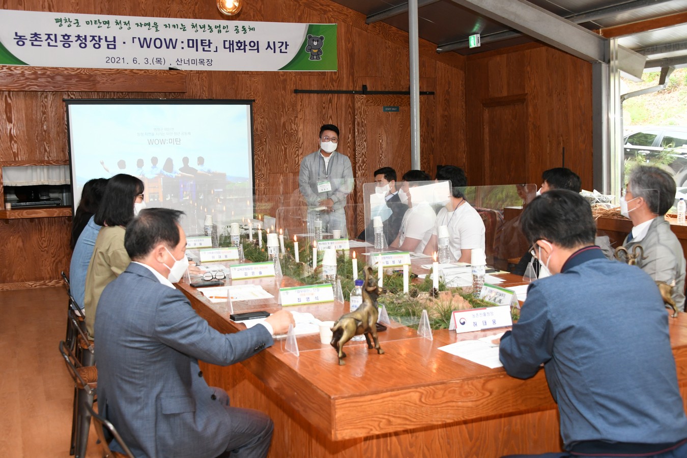 이날 간담회에서는 평창군 미탄면을 찾은 허태웅 농촌진흥청장이 청년 농업인이 현장에서 겪는 어려움과 건의사항 등을 청취하였으며, 한왕기 평창군수도 간담회 자리에 참석하여 청년농업인을 격려하는 한편, 평창군 추진사업인 농업인 가공공장 육성을 위한 농산물 가공 사업 등을 건의하였다.