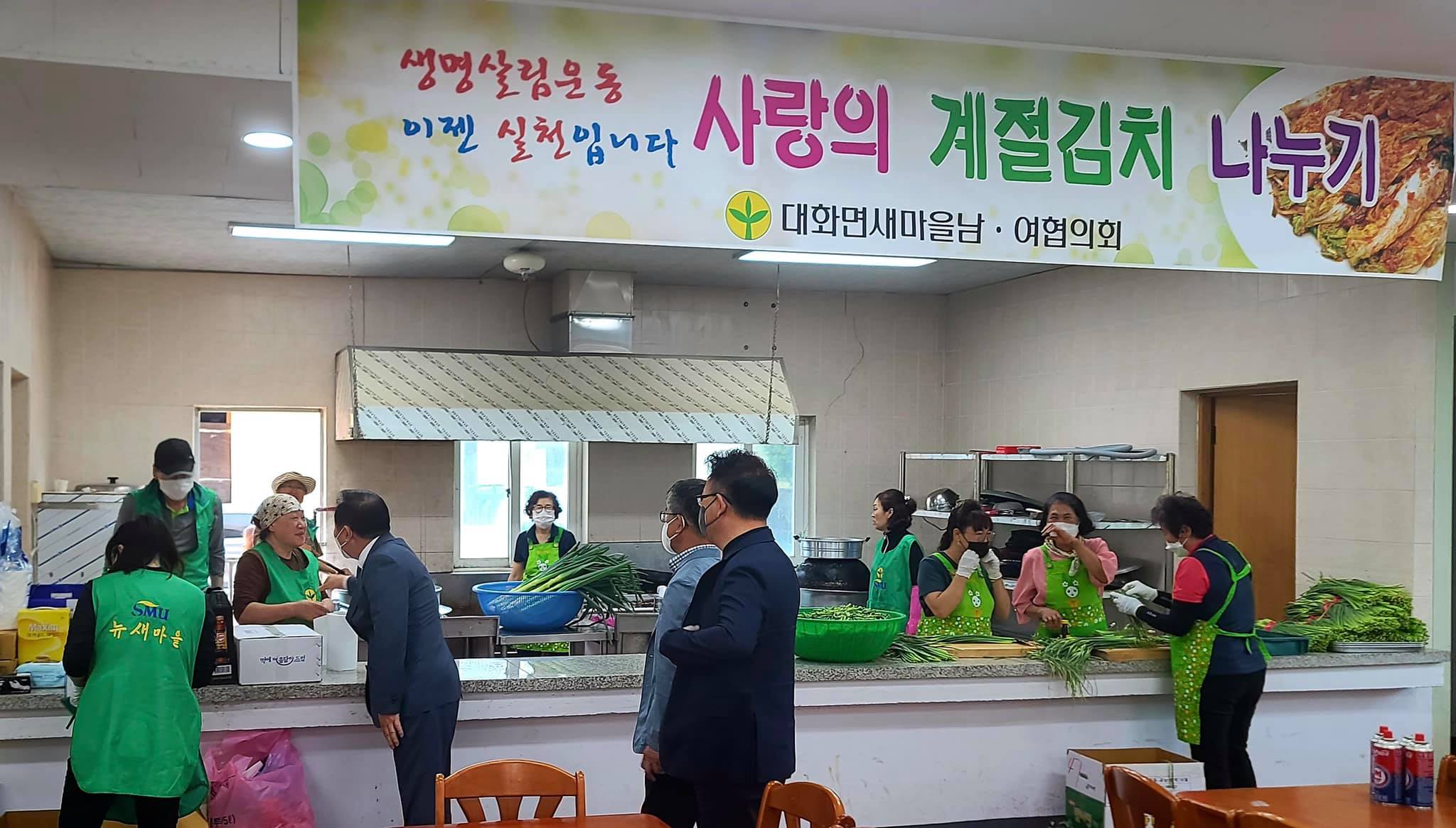 한왕기 군수는 사랑의 계절김치 담그기를 위해 애 쓰시는 대화면 새마을남녀지도자협의회 (회장 김명수, 마영희)를 방문해 "언제나 내 일처럼 앞장서 봉사해 주시는 새마을 가족여러분께 진심으로 감사드린다."고 감사의 마음을 전했다.