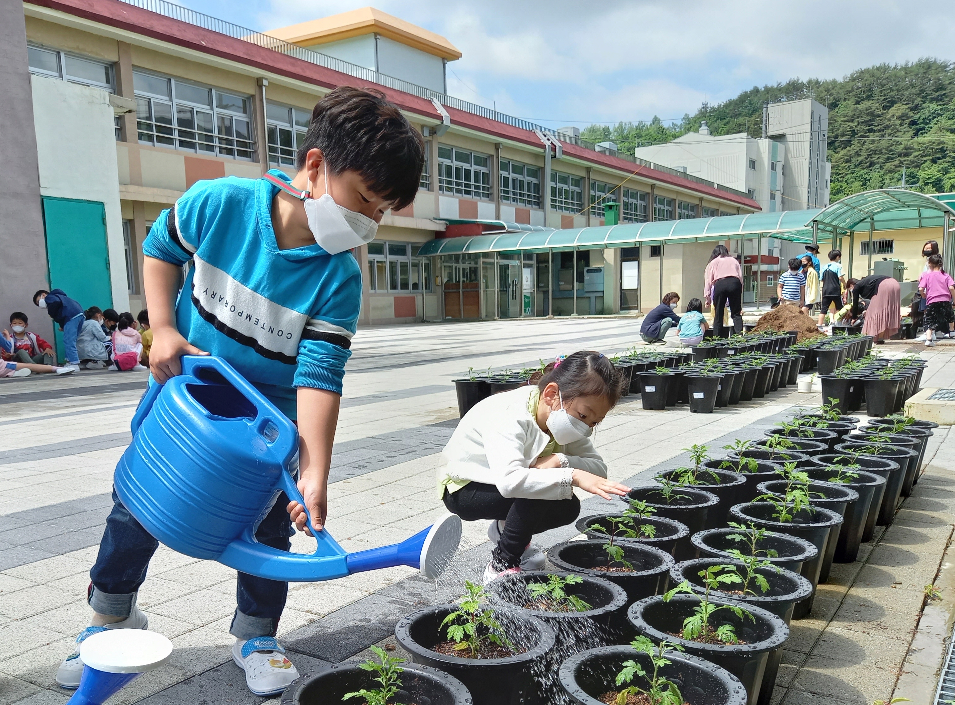 대화초등학교 학생들은 2021년 6월 2-4일에 학교 뒤 뜰에서 전교생을 대상으로 국화심기 활동을 실시하였다.