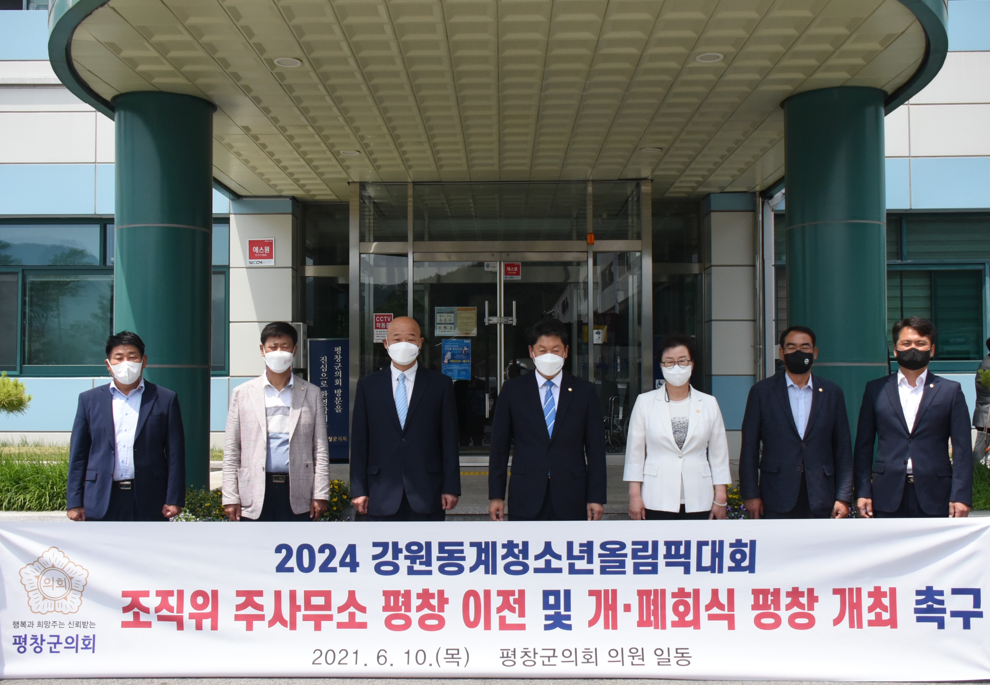 평창군 의회전수일 군의 장외 전체 군의원 6명(이주웅 부의장,장문혁 의원,박찬원 의원,지광천 의원, 심현정 의원,이명순 의원)은 2024 강원 동계청소년올림픽대회 조직위원회의 주사무소가 서울에서 강릉으로 이전 결정됨에 따른 평창군 의회의 입장을 의회 의결을 얻어 성명서를 발표했다.