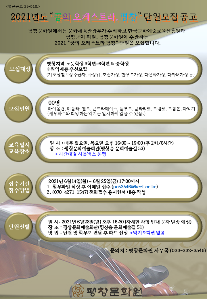 평창문화원(원장 이욱환)은 문화체육관광부가 주최하고 한국문화예술교육진흥원과 평창군이 지원, 평창문화원이 주관하는 2021 "꿈의 오케스트라 평창" 단원을 모집한다고 밝혔다.