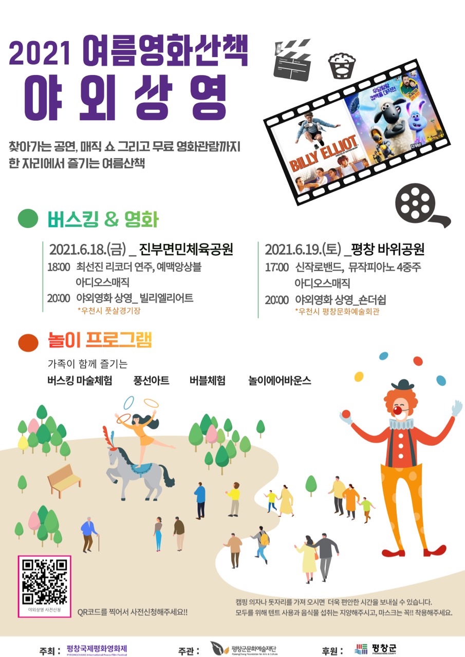 야외상영은 마스크 착용, 발열체크, 명부작성 및 생활 속 거리두기 등의 정부의 코로나19 방역수칙을 준수하여 사전 신청자에 한해 선착순으로 무료입장할 수 있고, QR 코드를 통해 사전 신청이 가능하며, 기타 행사 관련 문의는 평창군문화예술재단 홈페이지(www.artpc.co.kr) 또는 공연사업팀(033-330-7108)으로 문의하면 된다.