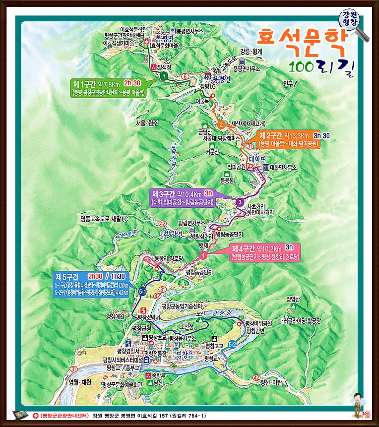 걷기 코스는 효석문학100리길” 2구간으로, 땀띠공원에서 담소쉼터까지 1시간 정도 소요되는 코스로, 코로나19로 힘든 시기를 보내고 있는 지역주민에게 잠시나마 힐링의 시간이 될 수 있도록 선정한 6월의 짙은 초록과 꽃향기가 가득한 걷기 좋은 길이다.