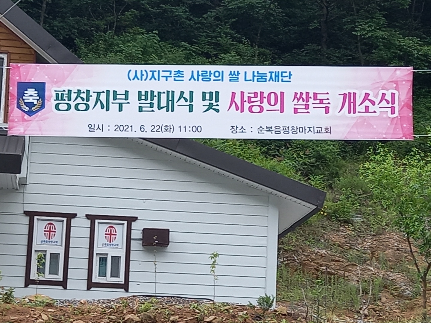 사단법인 지구촌사랑의쌀나눔재단(이사장 이선구 목사)은 지난 22일 오전 11시 순복음평창마지교회(담임 정흥교 목사)에서 평창군지부 발대식 및 ‘사랑의 쌀독’ 개소식 행사를 했다.