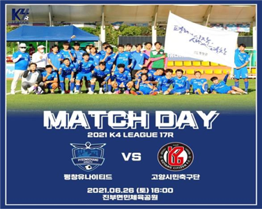 내일(6.26.) 16:00, 평창유나이티드FC(대표이사 정정택)는 진부체육공원 천연잔디구장에서 고양시민축구단과의 리그 17라운드(홈경기) 경기를 진행할 예정이다. 한편 평창유나이티드FC는 15경기에서 9승 0무 6패, 승점27점으로 현재 5위를 달리고 있어 계속해서 승리 할 수 있도록 관내 주민들의 많은 관심과 참여가 필요하다.
