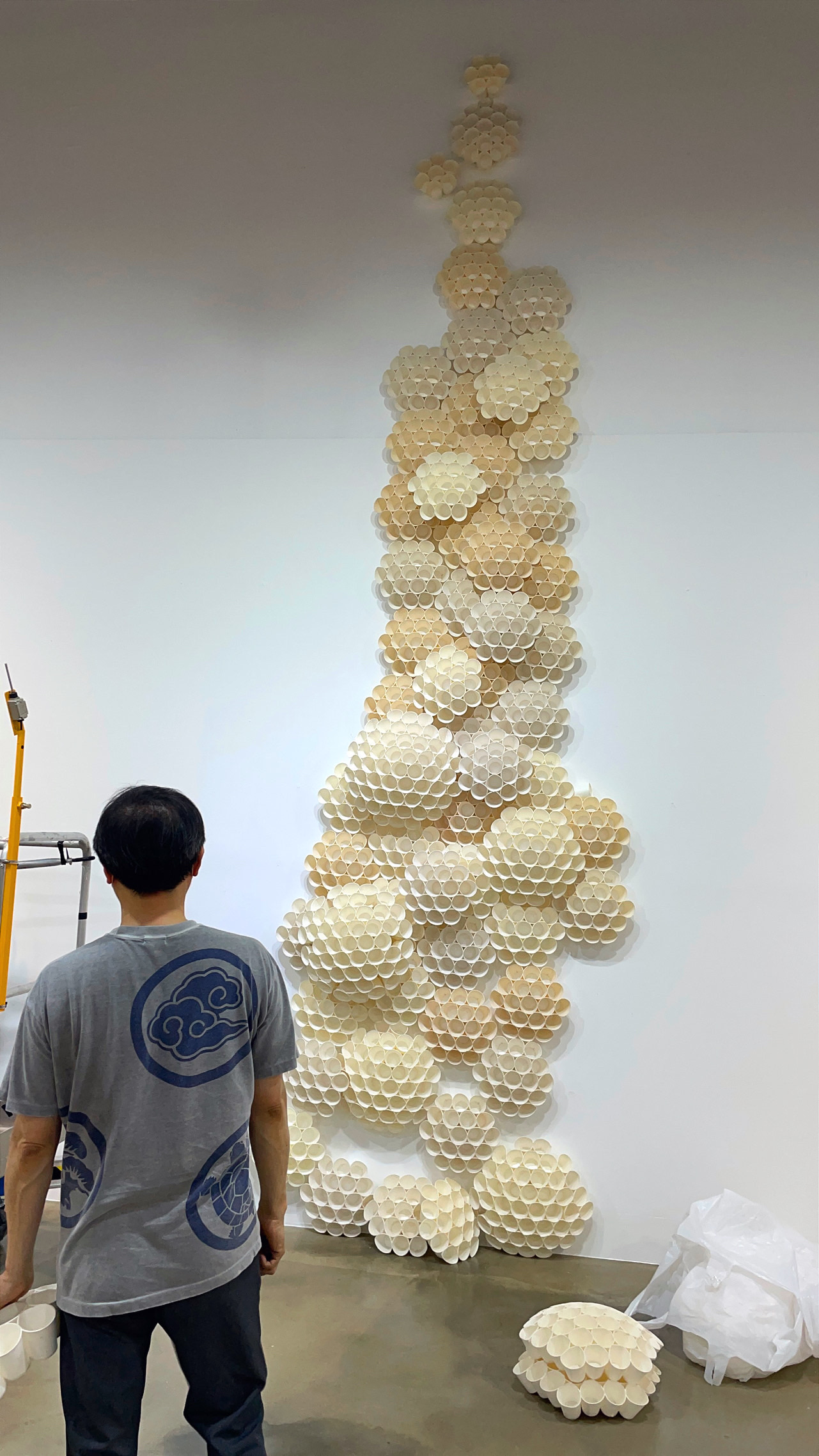 “이 일회용품들은 인간의 편의를 위해 매일매일 쏟아져 나온 것들이지만 무한 반복되어 결국은 폐기되어 버린 삶의 허무한 기록물들입니다. 기계적이고 자연 파괴적인 동시에 무책임한 인간성의 상징처럼 느껴지는 일회용품에는 그것을 사용했던 사람들의 일상의 찰나성(刹那性)도 짙게 새겨져 있습니다. ”