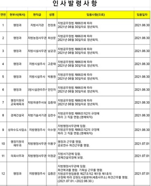 6.28일 평창군 인사발령