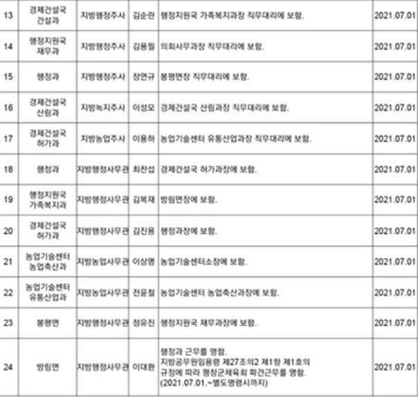 6.28일 평창군 인사발령