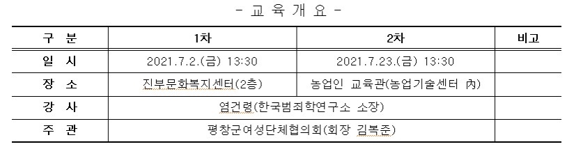 교육은 염건령(한국범죄학연구소 소장)씨가 진행하며 북부권과 남부권으로 나누어 진행된다. 북부권은 오는 7.2일 금요일 13:30분에 진부문화복지센터 2층에서 열린다. 남부권은 7월 23일 금요일 13:30분에 농업인 교육관(농업기술센터)에서 진행될 예정이다.