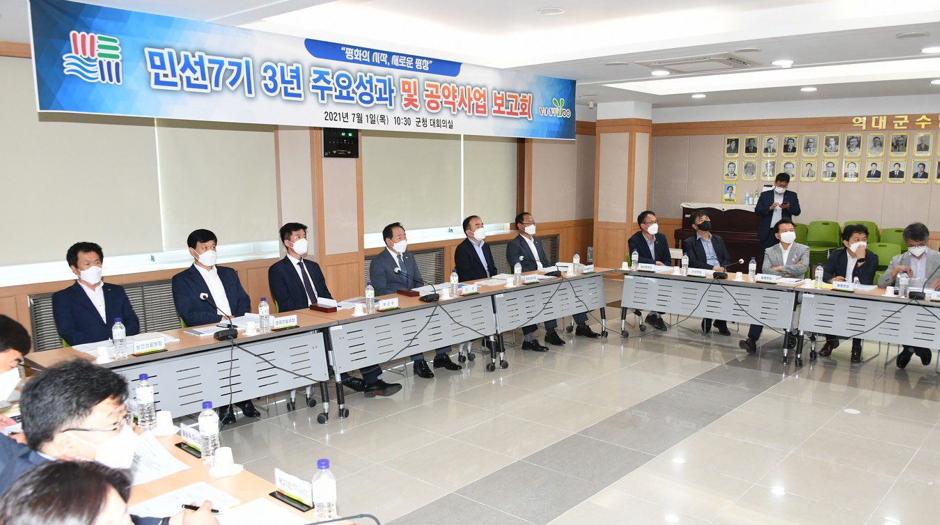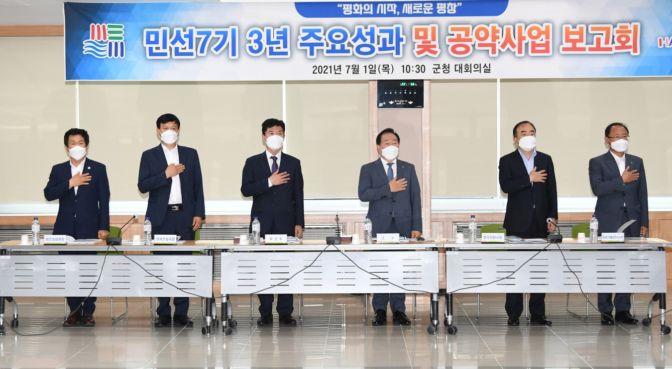 (7.1.) 10:30, 평창군 기획실은 군청 대회의실에서 국·실·과·소장과 읍·면장 등 50여 명이 참석한 가운데 민선7기 3주년 성과 및 공약사항 보고회를 개최했다.