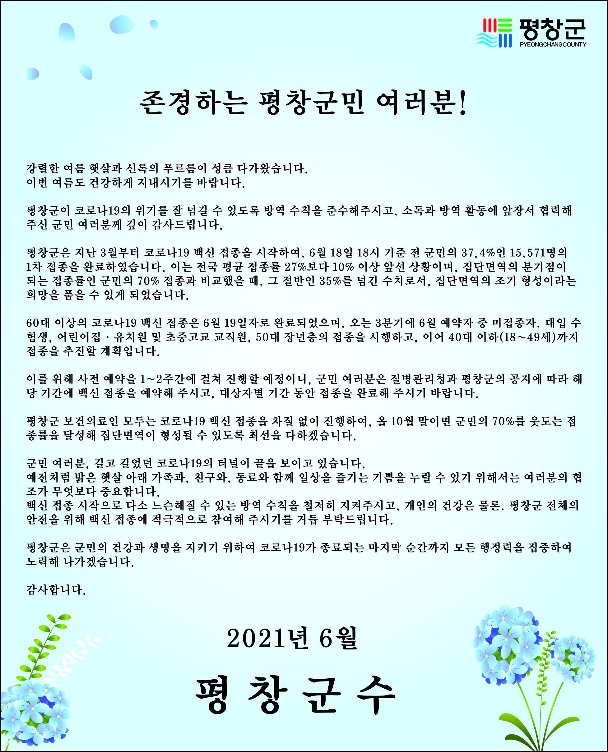 평창군수는 이 서한문에서 전 국민의 70% 백신접종으로 집단면역 체계 형성을 통해 시민들에게 잃어버린 일상을 돌려드리는 것이 평창군의 목표이며, 이를 위해 코로나19 백신접종을 차질 없이 진행할 수 있도록 준비하겠다.”고 밝혔으며, “사회적 거리두기 완화로 느슨해질 수 있는 방역 수칙을 철저히 지켜주실 것을 부탁드린다.”고 당부했다.