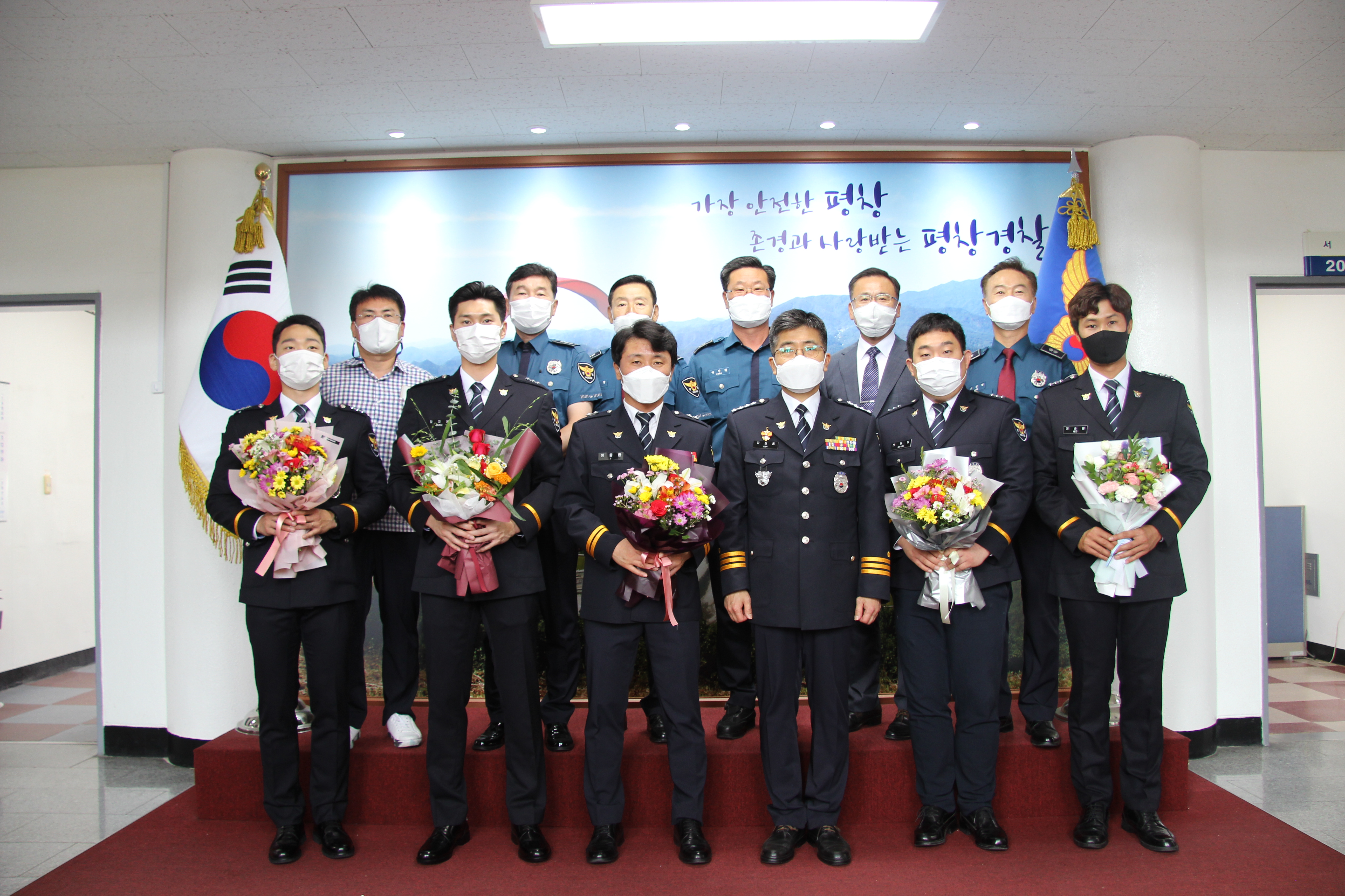 평창경찰서(서장 김희종)에서는 6. 30.(수) 09:00 평창경찰서 2층 포토존에서 직원들이 참석한 가운데 생활안전교통과 이종환 경감, 여순철 경장, 정보안보외사과 김태형 경장, 장지윤 경장, 대화파출소 신현삼 경장에 대한 승진임용식을 개최하였다. 승진임용식은 코로나19 대응지침에 따라 마스크 착용, 체열 측정 후 필요 최소인원 참석으로 진행했다.