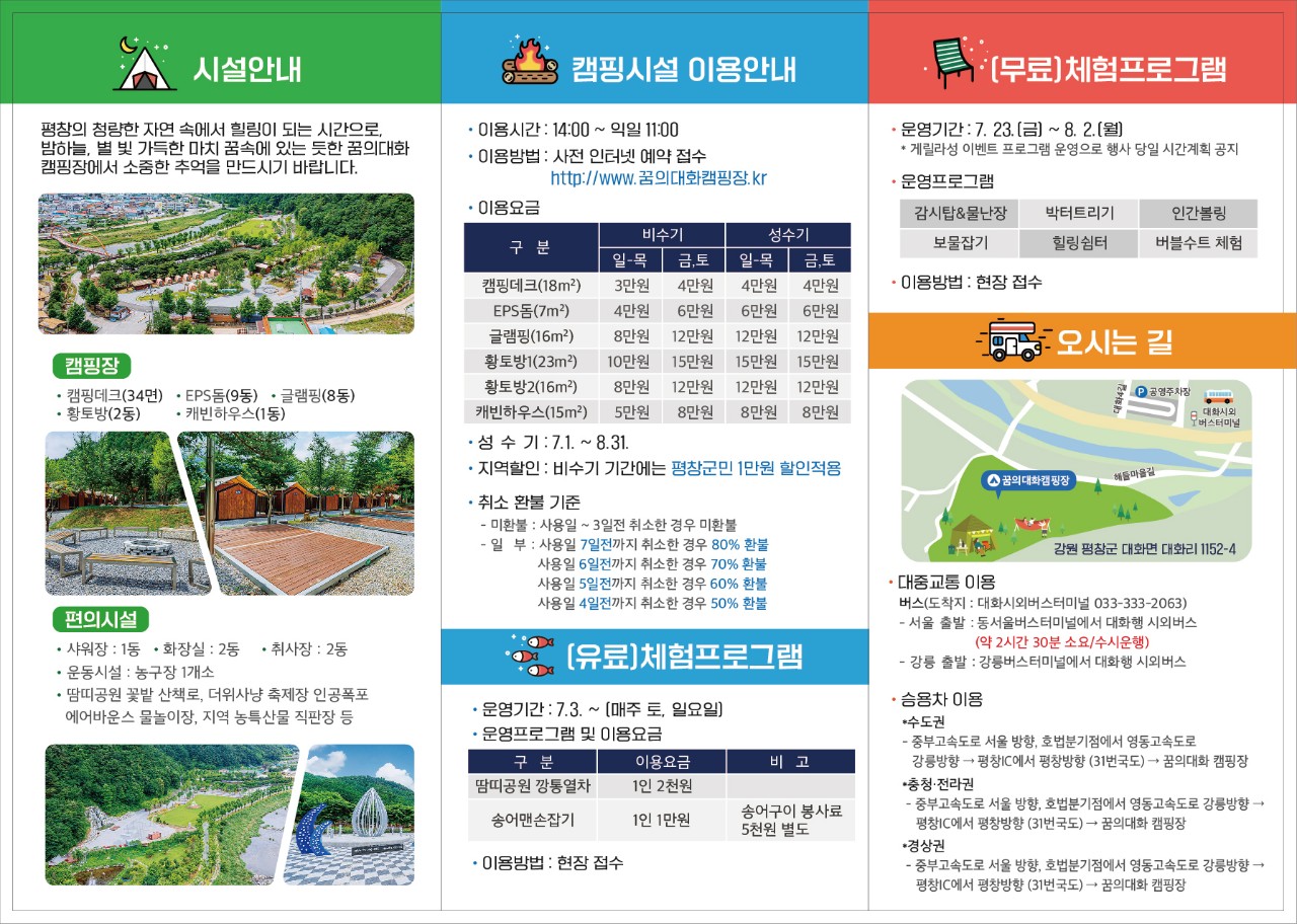 이용화 대화면장은 “지역 대표축제인 더위사냥축제가 취소된 가운데 지역의 분위기가 위축되는 것을 방지하고 나아가 활력을 되찾고자 평창더위사냥축제위원회에서 꿈의 대화 캠핑장 운영에 최선을 다하고 있다.”며, “꿈의대화 캠핑장이 지역 주민은 물론 대화를 찾는 모든 관광객들에게 잊지 못할 추억을 선사하고 힐링할 수 있는 대화면의 대표 명소가 되길 바란다.”고 전했다.