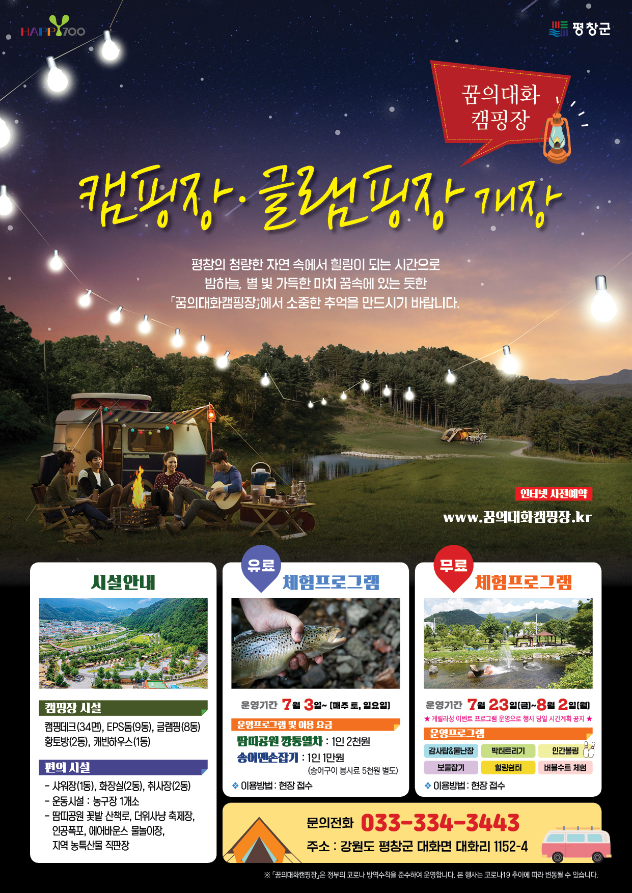 이용화 대화면장은 “지역 대표축제인 더위사냥축제가 취소된 가운데 지역의 분위기가 위축되는 것을 방지하고 나아가 활력을 되찾고자 평창더위사냥축제위원회에서 꿈의 대화 캠핑장 운영에 최선을 다하고 있다.”며, “꿈의대화 캠핑장이 지역 주민은 물론 대화를 찾는 모든 관광객들에게 잊지 못할 추억을 선사하고 힐링할 수 있는 대화면의 대표 명소가 되길 바란다.”고 전했다.
