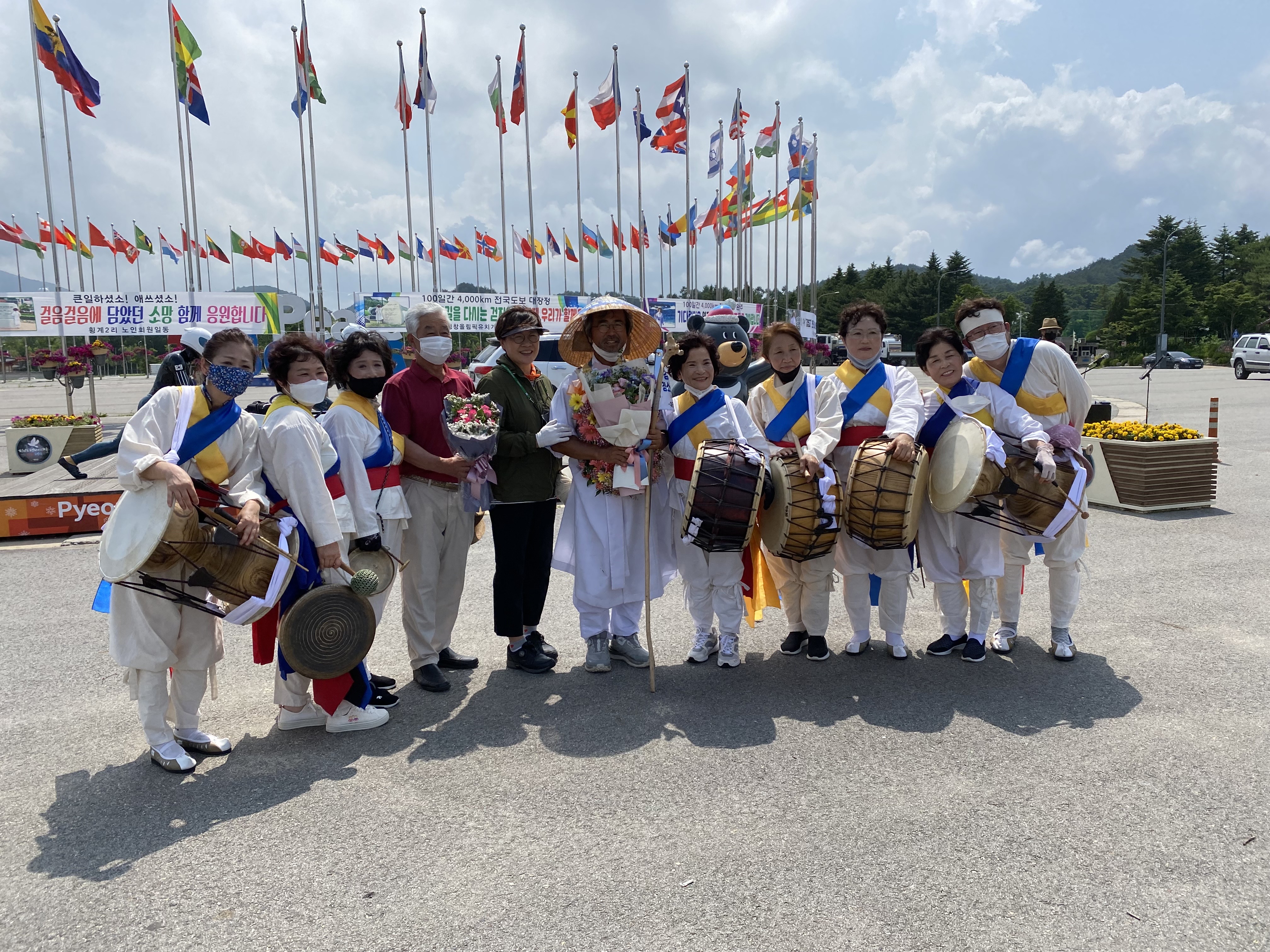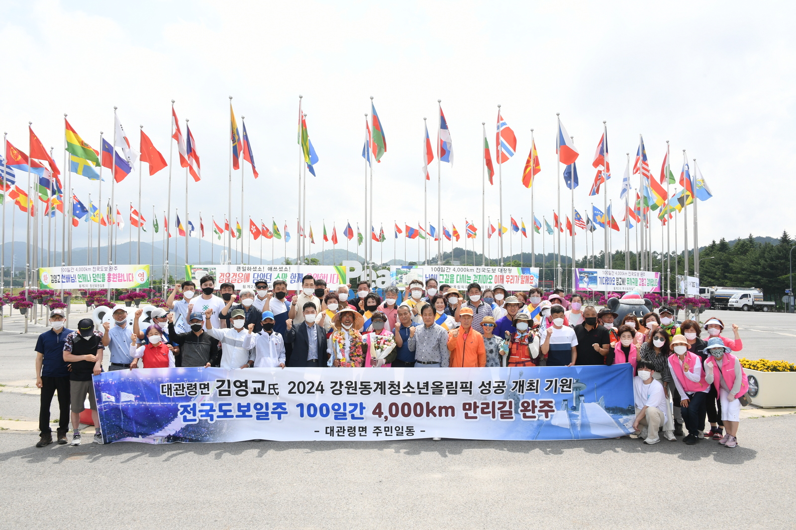 대관령 스키 역사 박물관장 김영교씨의  2024강원동계청소년올림픽 성공개최와 조직위원회 사무소 평창이전 및 올림픽유치기념관 걸립등을 기원하며 실시한 100일 동안 4,000km 전국도보일주가 지난 7일 98일만에 평창군에 도착하면서 성공리에 완주했다. 군청앞에서 한왕기 군수와 군청 직원들의 환영을 받았다. 지역주민들의 환영도 이어졌다. 9일 오후   대관령면 올림픽프라자에서 주민 150여 명이 함께한 가운데 환영행사가 진행되었다.