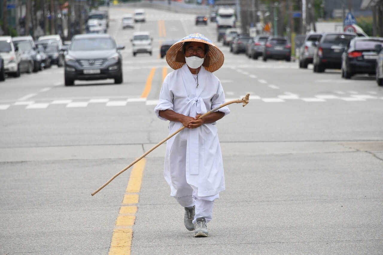 첫날부터 발에 물집이 생겨서 터지는 고생을 했지만 완주를 한 지금은, 쓰라리던 상처에 새살이 돋아나 굳은살로 변했다. 밤잠은 차에서 자고 식사는 시골 주막이든 횟집이든 발길 가는 곳에서 해결했다. 흰 한복에 삿갓을 쓰고 누런 속살을 드러낸 구부러진 나무 지팡이는 손잡이. 바랑 끝에 매달려 떨어질 듯 흔들거리는 짚신 한 켤레가 안동김씨 김삿갓의 후예임을 알려주었다.