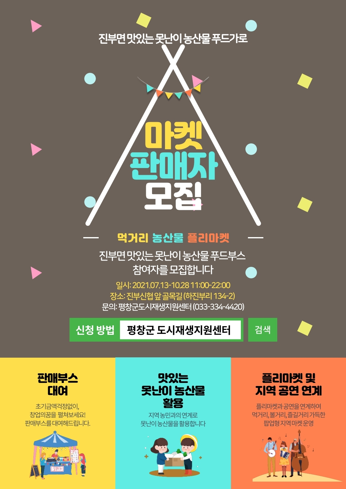 진부면 도시재생예비사업단에서는 진부면 푸드스트릿 사업에 관심 있는 개인 및 자영업자를 모집한다. 디자인 푸드부스, 직거래 땡처리 마켓부스, 플리마켓, 골목공연 등 분야별 참여업체를 모집한다.