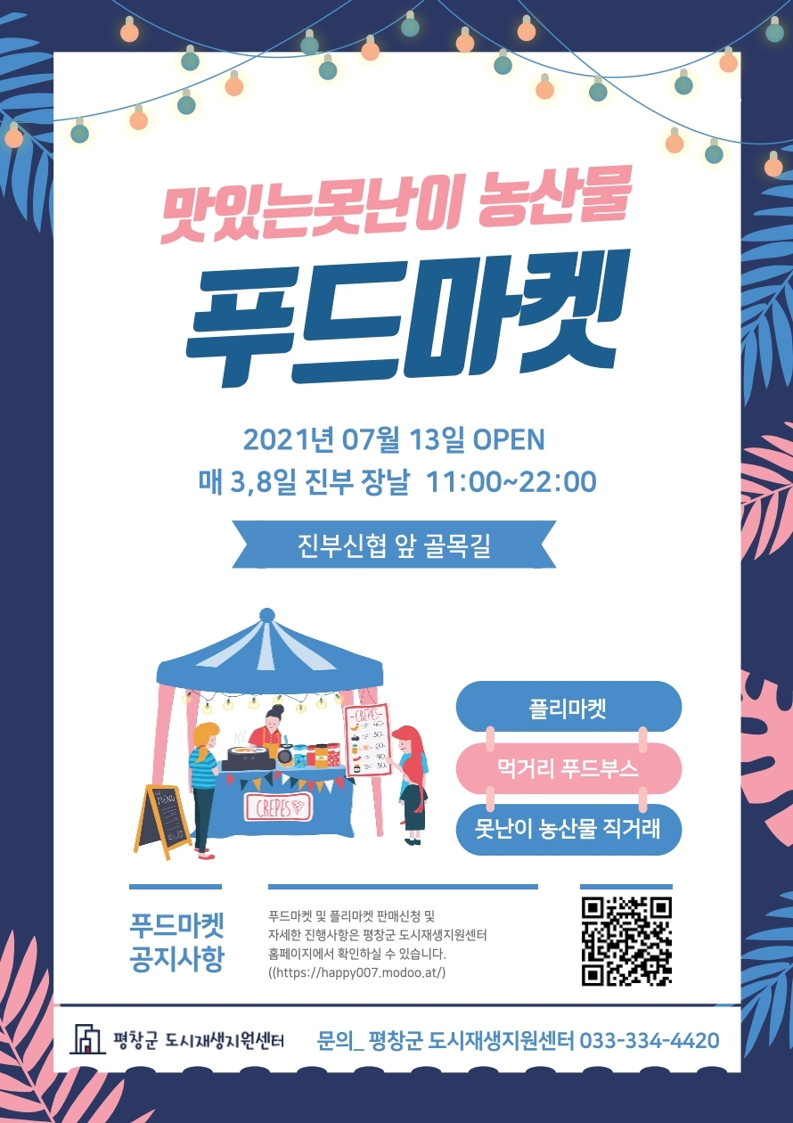 평창군 진부면 도시재생 예비사업단은 규격에 맞지 않아 파지되는 못난이 농산물을 활용하여 푸드 팝업(Pop-up)부스 ‘맛있는 못난이 농산물 푸드스티릿’을 운영한다고 밝혔다. 농민, 주민, 상인 3자가 서로 상생하고 지역 농산물 판로확대로 지역경제 활성화를 추진하기 위해 열리는 이번 행사는 빛나는 작은 맛집 「소소미당」이라는 타이틀로 7월 13일부터 10월 28일까지 5개월간 매월 3, 8일 장날마다 10:00~22:00까지 운영된다.