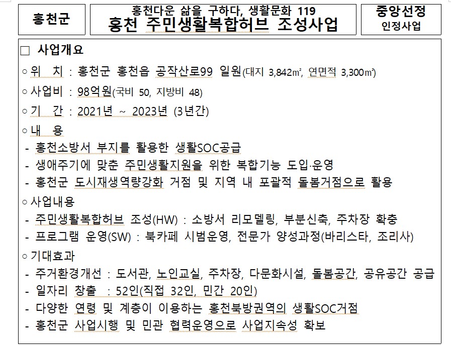 홍천군은 홍천읍에 소재한 구 홍천소방서 건물을 리모델링하여 “주민생활 복합허브” 공간으로 조성하는 계획으로 국비 50억을 포함하여 총 98억원으로 도서관, 노인교실 등 생활 SOC를 주된 사업내용으로 하여 곧 설계공모를 거쳐 내년 상반기 착공할 계획이다.
