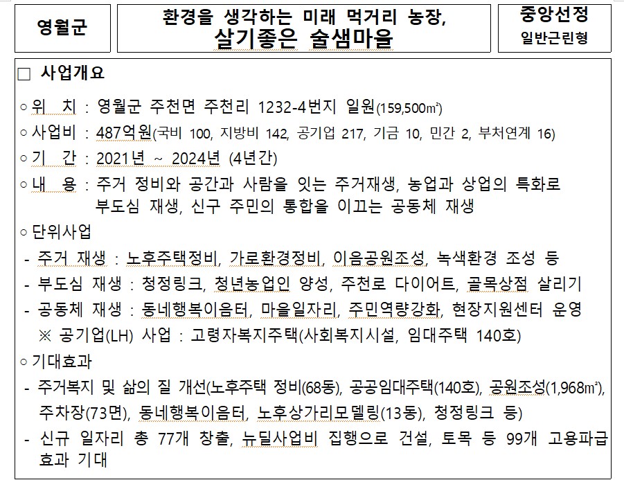 - 강원도 2곳 신청 ⇒ 2곳 선정(홍천 인정사업, 영월 총괄사업관리자)