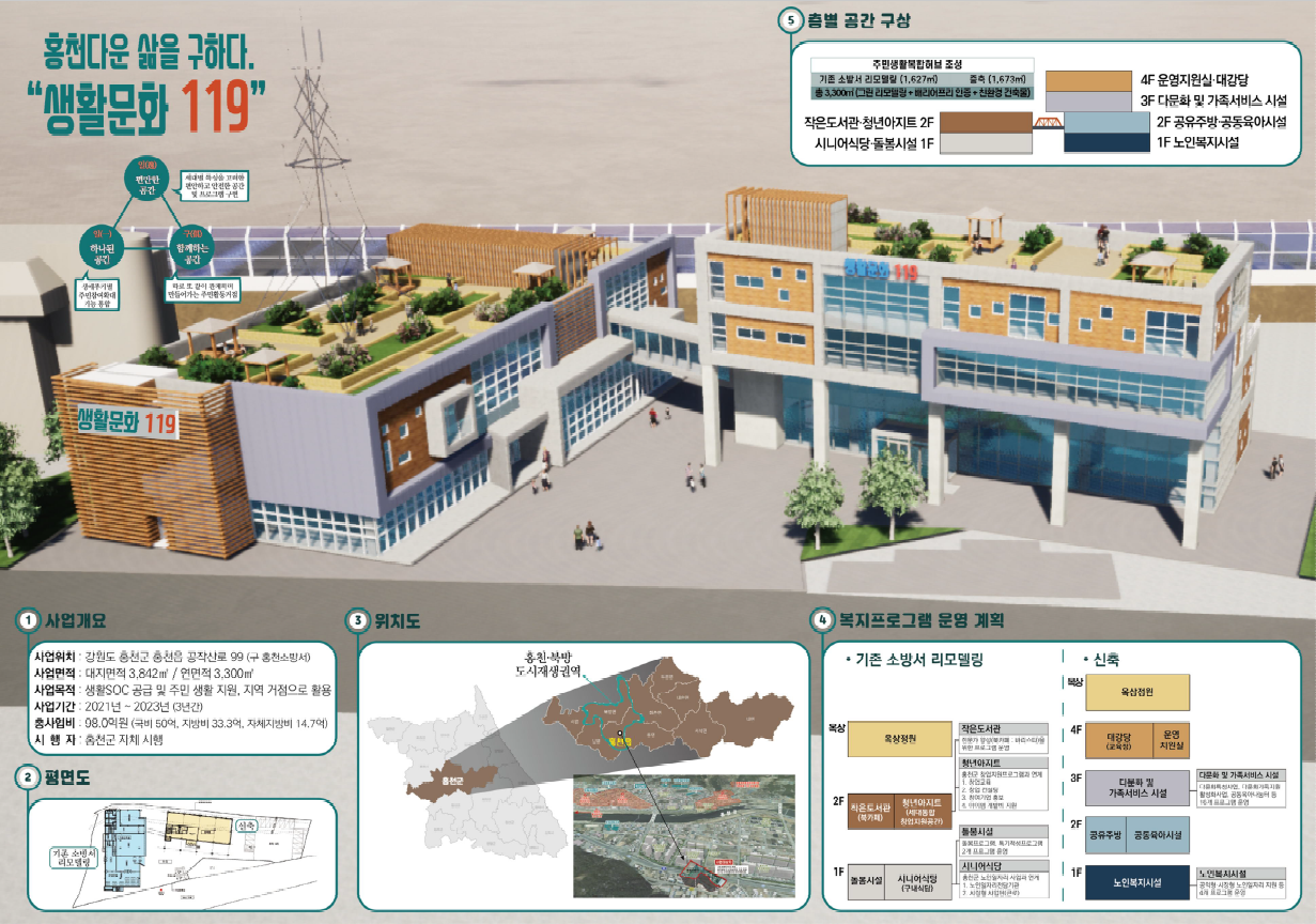 홍천군은 홍천읍에 소재한 구 홍천소방서 건물을 리모델링하여 “주민생활 복합허브” 공간으로 조성하는 계획으로 국비 50억을 포함하여 총 98억원으로 도서관, 노인교실 등 생활 SOC를 주된 사업내용으로 하여 곧 설계공모를 거쳐 내년 상반기 착공할 계획이다.