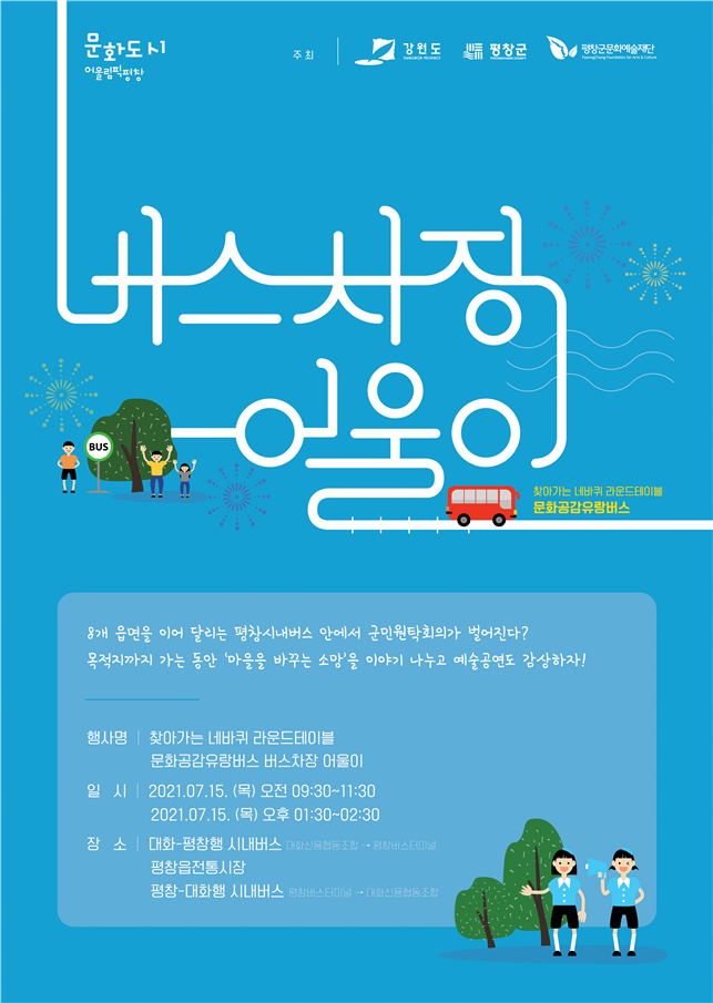 그 첫 번째 행사로 15, 평창군과 평창군문화예술재단이 공동으로 대화면과 평창읍 장터 일대에서 찾아가는 네 바퀴 라운드테이블 - 문화공감유랑버스 <버스차장 어울이>’ 진행한다.