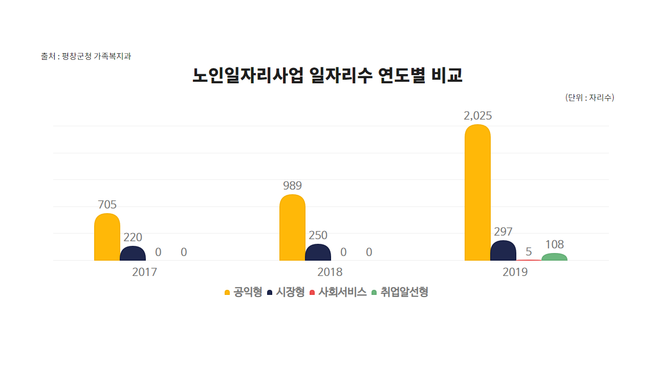 초고령화 사회에 발맞추어 노인복지를 확대했다. 2018년 취임 이후로 3년간 농촌 어르신 일자리를 925명에서 21년 2,514명 확충으로 3배 가까이 늘렸다. 경로당 지원 확대운영으로 운영비를 현실화하여 지원하고 정부미를 평창쌀 교체했으며 공기청정기 제공했다. 또 독거 어르신 응급안전 알림 서비스 등을 추진했다. 나아가 경로당 없는 마을 4개소 신축해 주민숙원사업 해소했다.