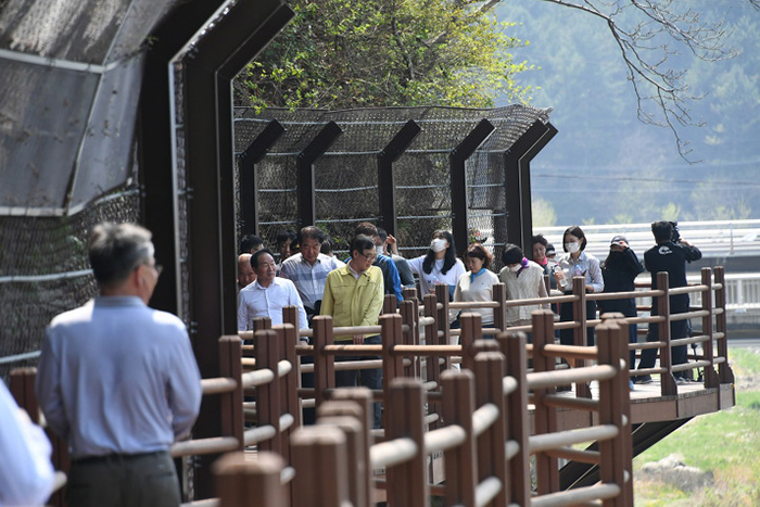 20년 5월 1일 열린 평창 평화길 개장식에서 한왕기 평창군수를 비롯한 관계자들이 평창 평화길을 걷고 있다.