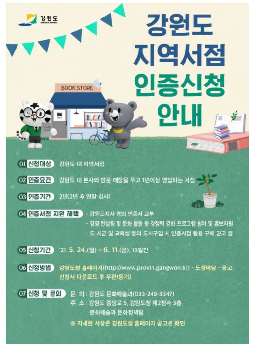 강원도는 지역서점 활성화 추진을 위해, 지난해「강원도 지역서점 활성화 지원 조례(20.12.31)」를 제정하였고, 올해에는 실질적 추진을 위한 사업비 확보, 지역서점 인증제도 실시 등 도내서점의 경영안정과 경쟁력 강화에 다 각적인 노력을 기울이고 있다. 앞으로, 인증받은 지역서점은 강원도지사 명의의 인증서를 교부(인증기간 : 2년) 받을 수 있다. 또한 인증된 서점은 경영컨설팅, 문화 활동 등 경쟁력 강화 프로 그램 참여할 수 있으며 각종 홍보를 지원받을 수 있다. 또 도와 시군·교육청을 비롯해 도내 공공도서관이나 작은도서관이 도서를 구매할 때 우선 구매 대상으로 권장하는 혜택을 받을 수 있게 된다.