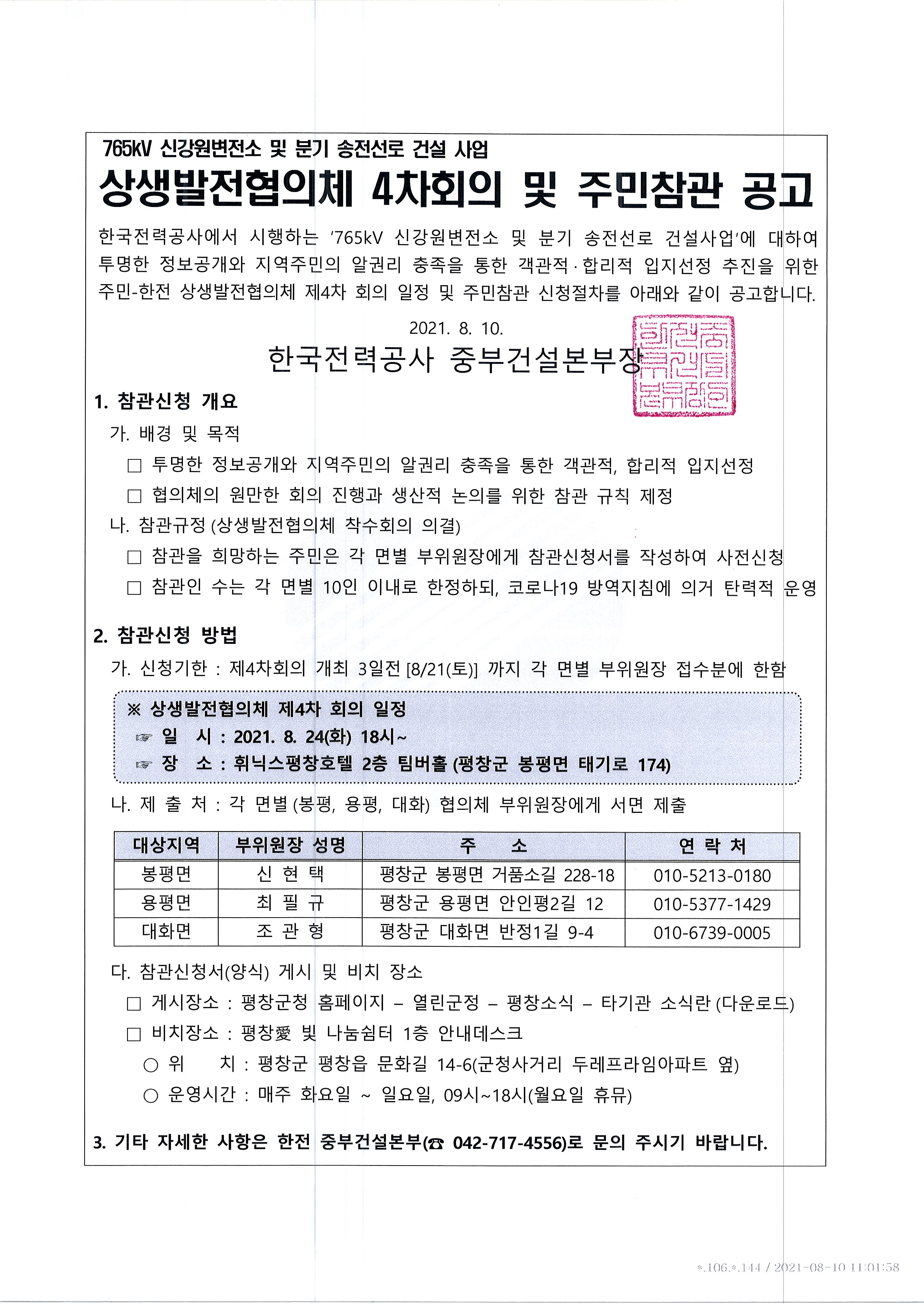 상생발전협의체 제4차 회의는 2021년 8월 24일 화요일 저녁 18시부터 휘닉스평창호텔 2층 팀버홀(봉평면 태기로 174)에서 진행한다.